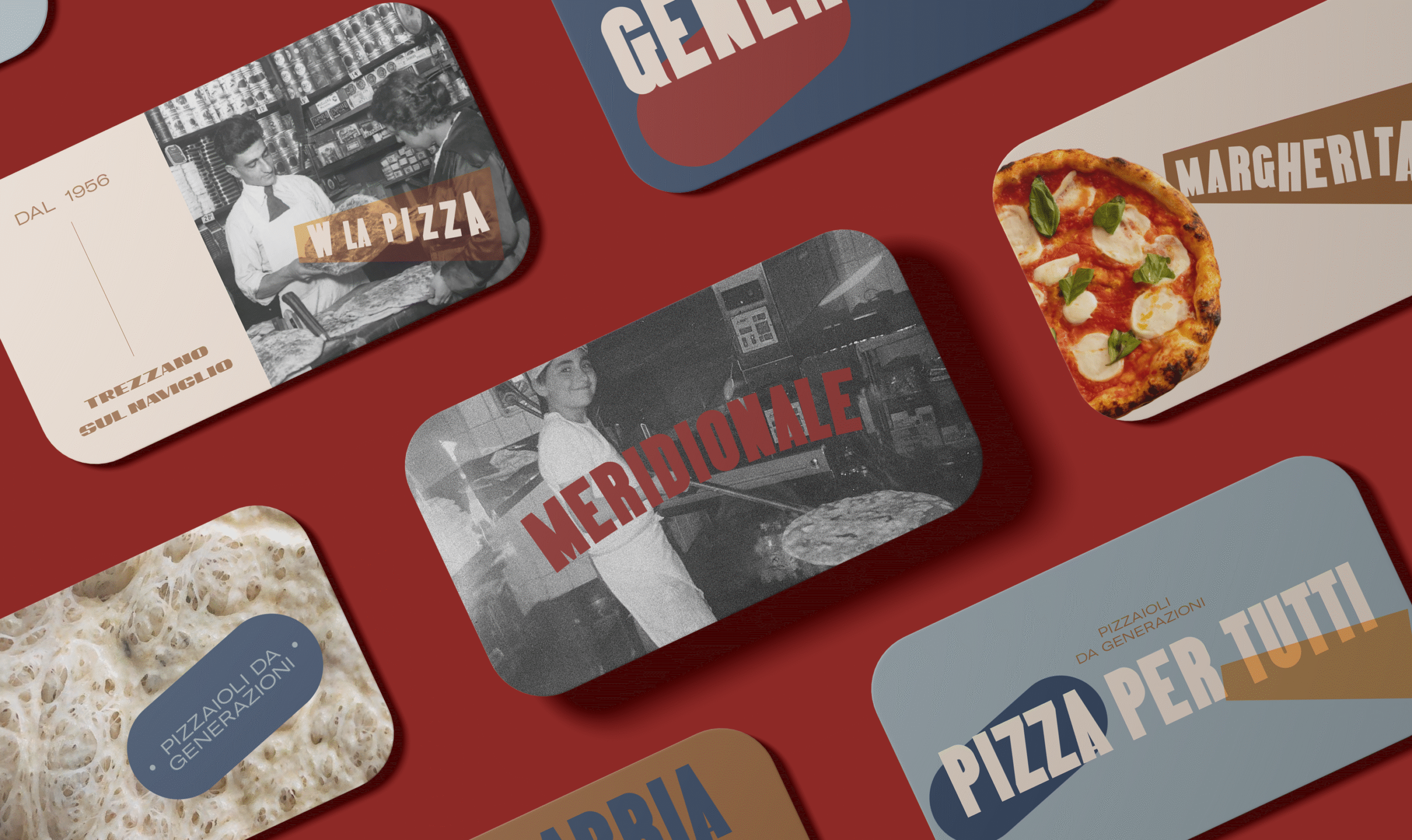 Il primo concept – quello poi selezionato – affonda le radici nella storicità della pizza italiana: un universo visivo composto da fotografie in bianco e nero cariche di emozione, lettering dallo stile retrò intenzionalmente imperfetto, riferimenti espliciti alle insegne d’epoca e alle cucine meridionali tradizionali. Un’estetica calda, nostalgica, con un forte richiamo alla manualità artigianale.